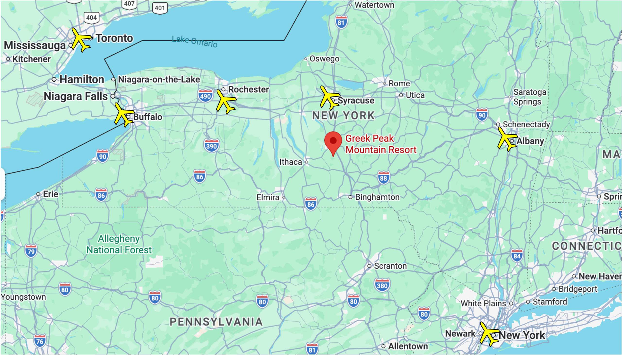 - Albany International Airport (ALB): 2.5 hours